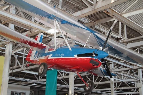 The main wing is also known as a “free wing”. This wing is allowed to find its own angle of incidence, which helps to absorb the most turbulent “bumps”, and is controlled up to a certain point by the Flettner tab (the long downward facing tab at the rear of the main wing). This special wing design, along with the enclosed cabin, fiberglass fuselage, distinctive folding wings, and the larger, more modern 80hp Rotax 912 engine made this model the most advanced of the Flying Flea family.