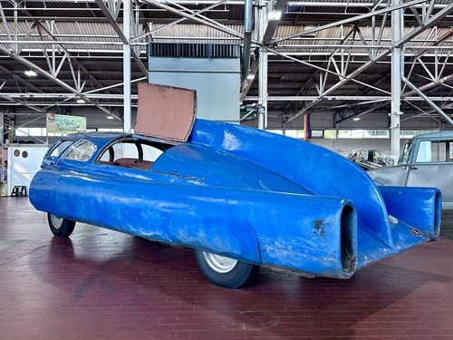 Sigvard Berggren embarked on creating his streamlined vehicle known as Future in 1951. Utilizing a retired taxi’s 1938 Dodge seven-passenger sedan chassis, he resourcefully installed a flathead Ford V8 engine in the mid-rear position of the vehicle. With help from a local mechanic, Henrik Neuman, and inspiration drawn from aircraft design, Berggren crafted a tubular steel frame and hand-formed steel panels, achieving an aerodynamic body looking like a wingless aircraft with a Tatra-esque dorsal fin. Despite underestimating the work ahead of them, they completed the Future for a newspaper deadline, gaining significant coverage for the vehicle in the early1950s. While its aircraft-inspired appearance garnered attention, its weight limited its performance.