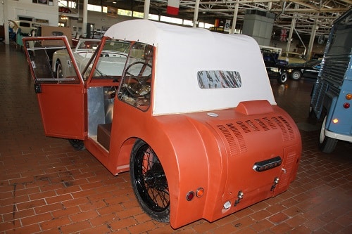 In post-WWII Europe, Communist Czechoslovakian cars were a rare commodity. Most people rode motorcycles and bicycles since most of the population simply could not afford a car. In 1948-49 The Automobile Club of the Czechoslovak Republic sponsored a competition to design a lidove vozitko, or people’s car. The only three requirements were that the vehicle had to carry two people, protect them from the elements, and get a minimum of 50 MPG. Twenty-two people submitted entries of designs and a running example, most built in home garages. None of the cars ever went into production, and although this car was not part of the competition, it was very likely influenced by this competition. Powered by a Puch 350cc motorcycle engine, with a Skoda license plate light and many other borrowed components, this was obviously someone’s attempt to build their own car because they could not afford to buy one. As strange as it may appear, on a rainy day it was much more comfortable than a motorcycle.