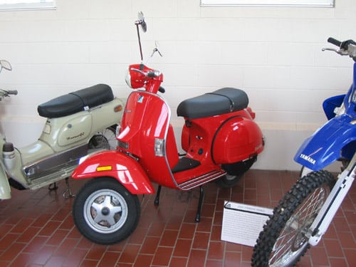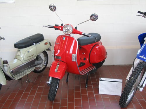 Piaggio was founded in Italy in 1884 as a business that made luxury ship fittings. By the end of the century, they were also producing rail carriages, luxury coaches, truck bodies, engines, and trains. When WWI began, the company turned to airplanes and seaplanes and was quite successful. The plant was totally destroyed during World War II, and the company turned its attention to the personal mobility needs of the Italian people. Drawing from aeronautical technology, a scooter was built. It had a unibody steel chassis shaped to protect the rider from road debris. By the end of 1949, 35,000 had been produced. Compared to a motorcycle, it was comfortable and quiet. Within ten years, over one million Vespas were produced. The Vespa is an icon of Italian style and elegance. The example you see here is actually a modern example.
